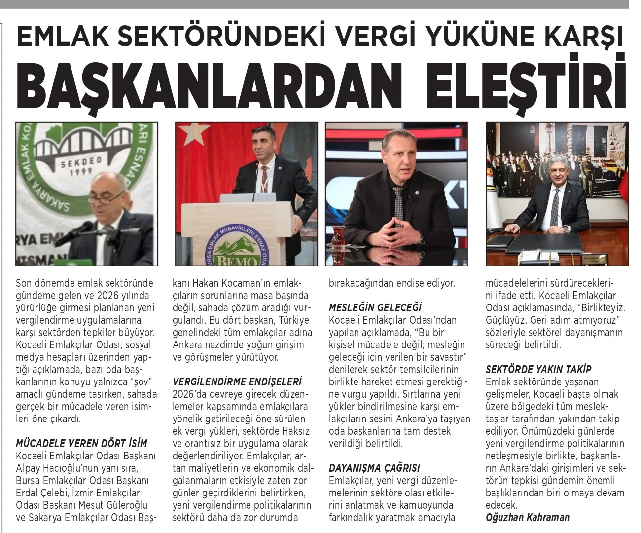 Kocaeli Emlakçılar Odası Başkanı Alpay Hacıoğlu’nun yanı sıra, Bursa Emlakçılar Odası Başkanı Erdal Çelebi, İzmir Emlakçılar Odası Başkanı Mesut Güleroğlu ve Sakarya Emlakçılar Odası Başkanı Hakan Kocaman’ın emlakçıların sorunlarına masa başında değil, sahada çözüm aradığı vurgulandı. Bu dört başkan, Türkiye genelindeki tüm emlakçılar adına Ankara nezdinde yoğun girişim ve görüşmeler yürütüyor.