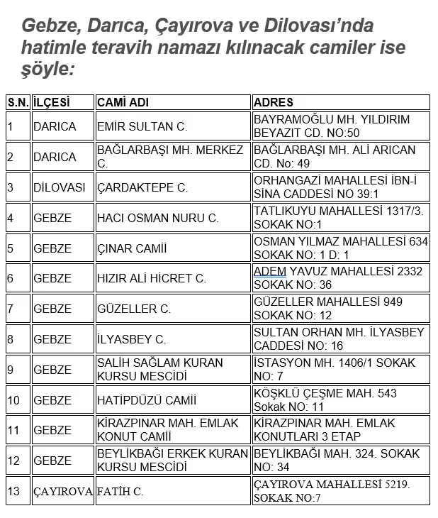İlk teravih namazı bu yıl 18 Şubat Çarşamba günü, yatsı namazının hemen ardından tüm İslam âleminde olduğu gibi Kocaeli’nin Gebze,Darıca,Çayırova ve Dilovası bölgesinde de cemaatle birlikte kılınacak. ilçelerinde hatimle teravih namazı kılınacak camiler Diyanet İşleri Başkanlığı tarafından ilan edildi. Dört ilçede toplam 13 camide hatimli teravih namazı kılınacak.