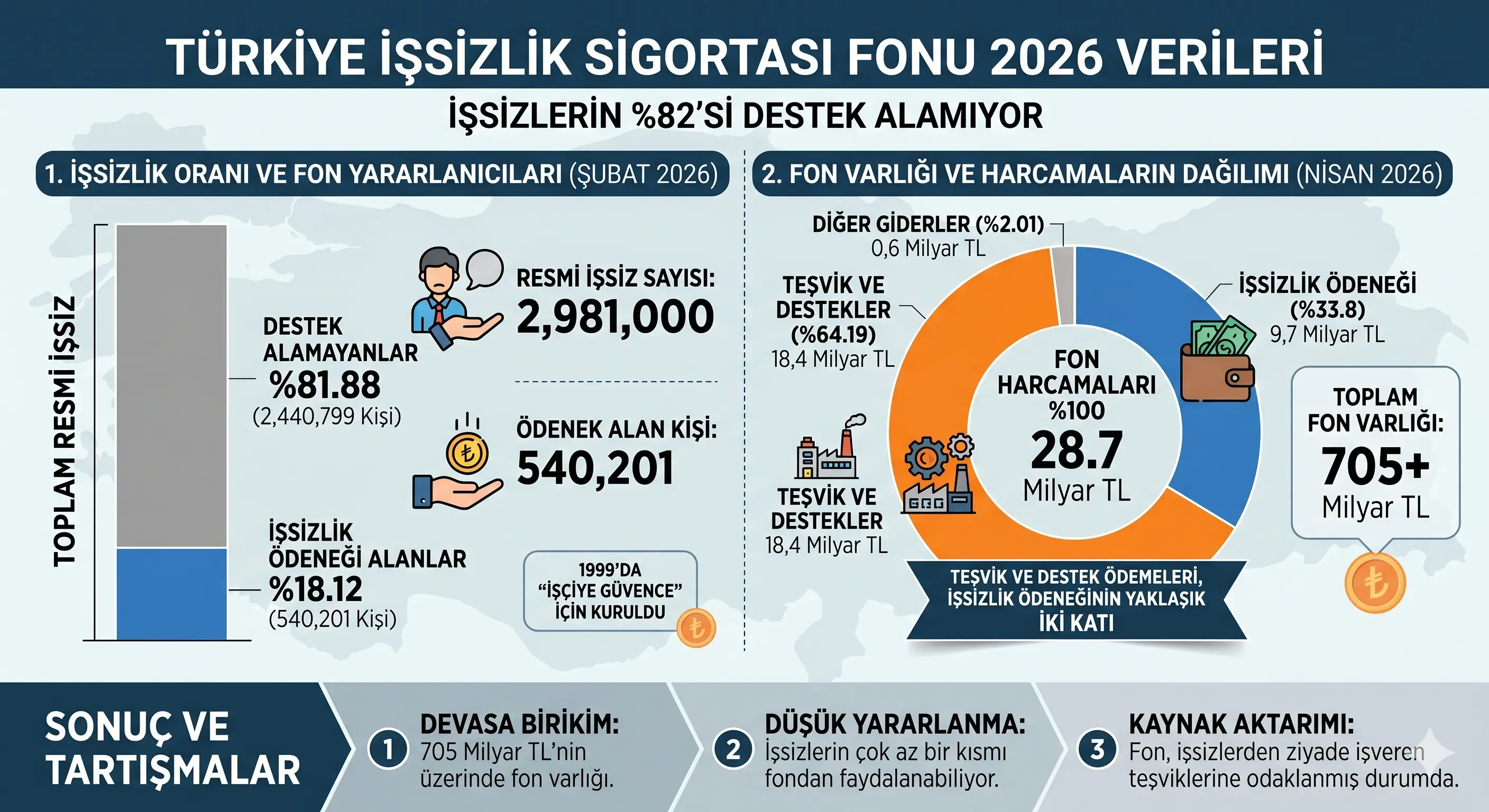 Uzmanlara göre, fonun kuruluş felsefesi olan “sosyal devlet” ilkesi 2026 itibarıyla tamamen aşınmış durumda. 705 milyar liralık birikim, işsizlerin yoksulluğunu gidermek yerine bir “sermaye transferi” aracına dönüşmüş vaziyette. Resmi işsizlerin sadece %18,12’sinin (540 bin kişi) ödenek alabiliyor olması, sistemin iflas ettiğinin en somut kanıtı olarak değerlendiriliyor.