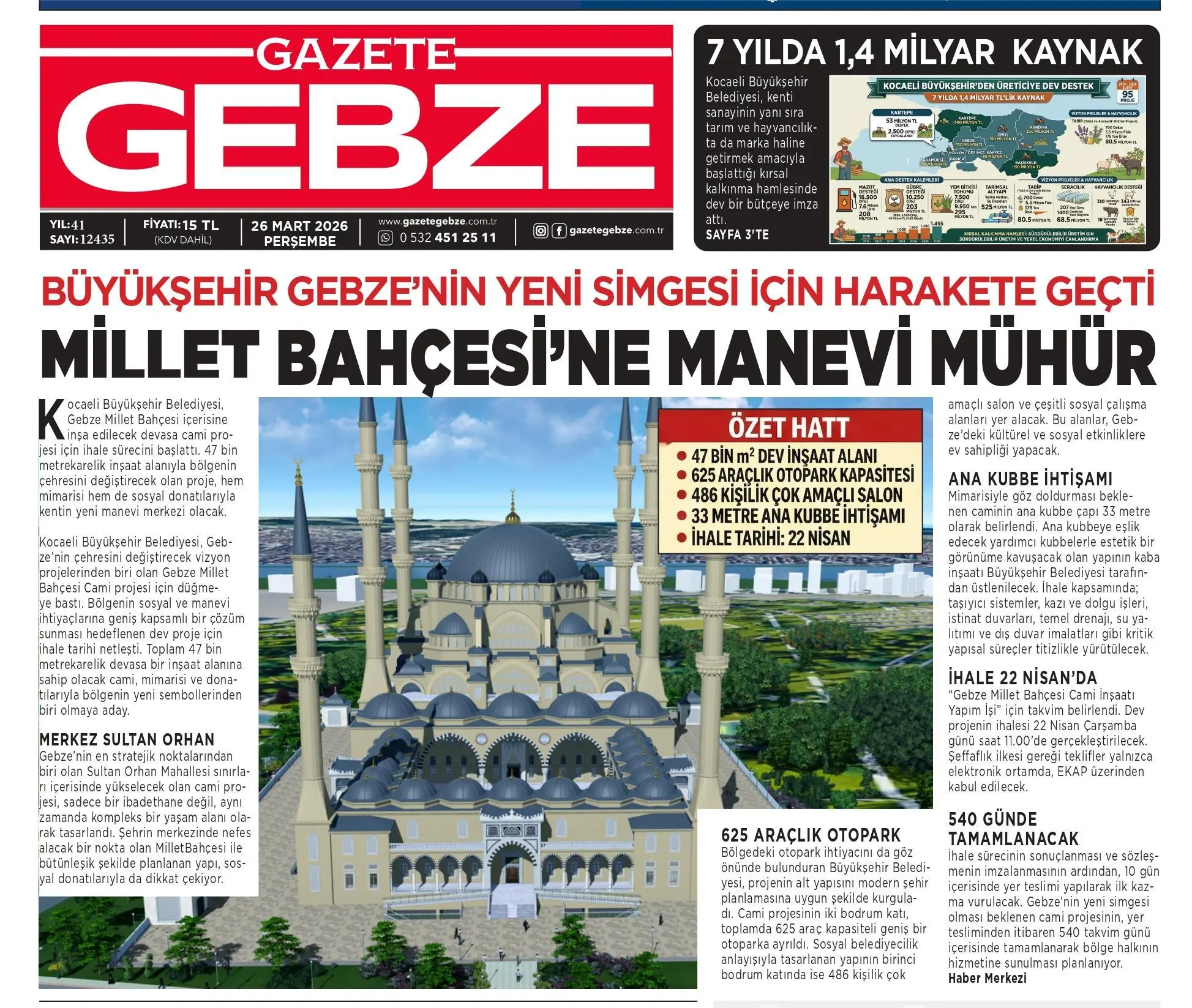 Kocaeli Büyükşehir Belediyesi, Gebze’nin çehresini değiştirecek vizyon projelerinden biri olan Gebze Millet Bahçesi Cami projesi için düğmeye bastı. Bölgenin sosyal ve manevi ihtiyaçlarına geniş kapsamlı bir çözüm sunması hedeflenen dev proje için ihale tarihi netleşti. Toplam 47 bin metrekarelik devasa bir inşaat alanına sahip olacak cami, mimarisi ve donatılarıyla bölgenin yeni sembollerinden biri olmaya aday.