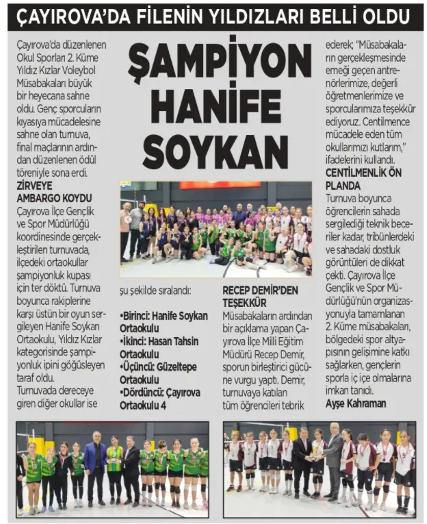 Çayırova İlçe Gençlik ve Spor Müdürlüğü koordinesinde gerçekleştirilen turnuvada, ilçedeki ortaokullar şampiyonluk kupası için ter döktü. Turnuva boyunca rakiplerine karşı üstün bir oyun sergileyen Hanife Soykan Ortaokulu, Yıldız Kızlar kategorisinde şampiyonluk ipini göğüsleyen taraf oldu.